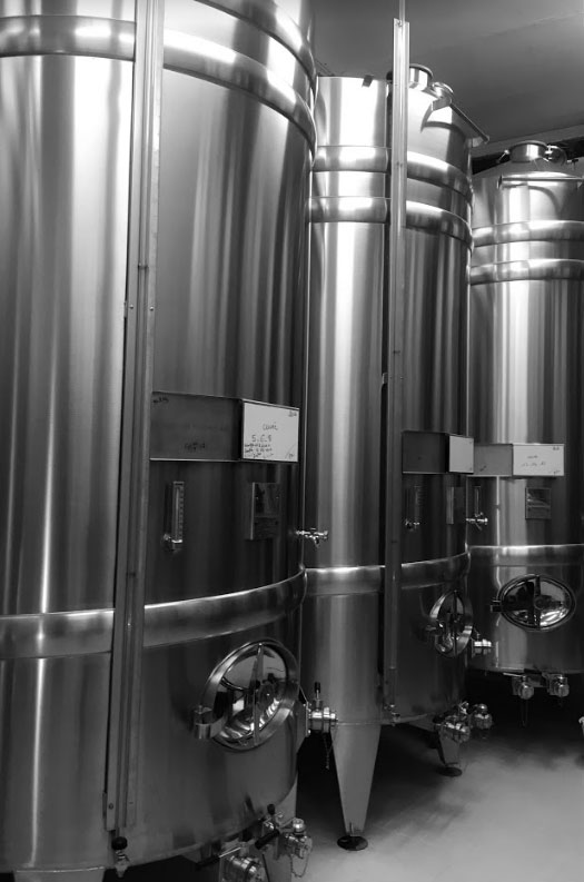 Les moûts (jus du raisin) fermentent dans les cuves pour devenir du vin à partir des sucres du raisin. La lie (dépôt) du vin est éliminée grâce à plusieurs soutirages avant la mise en bouteille.